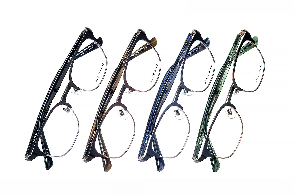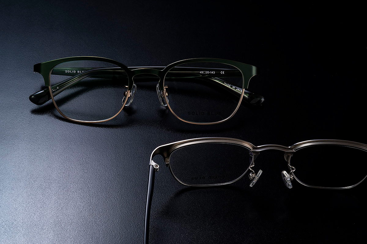 0.8mmのβチタンのシート材を使用して軽量に仕上げたメタルのブロウフレーム。ウェリントンに合わせたスマートなブロウラインは、柔らかさがありながらも凛とした雰囲気を作り出してくれます。負荷のかかりやすいブリッジ部分は構造を二重にすることで、デザイン性と強度を加えフレーム全体の剛性を高めました。